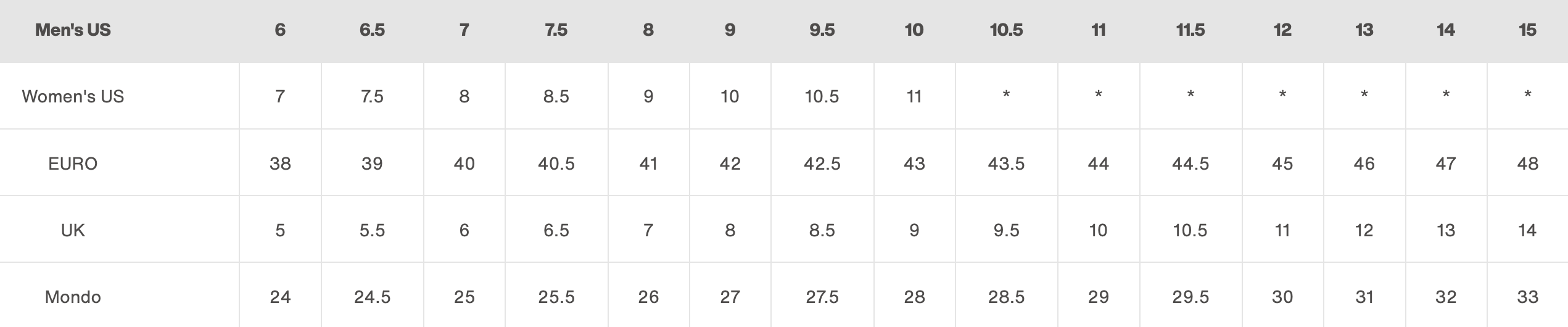 | EURO | 38.0 | 39.0 | 40.0 | 40.5 | 41.0 | 41.5 | 42.0 | 42.5 | 43.0 | 43.5 | 44.0 | 44.5 | 45.0 | 46.0 | 47.0 | 48.0 |
